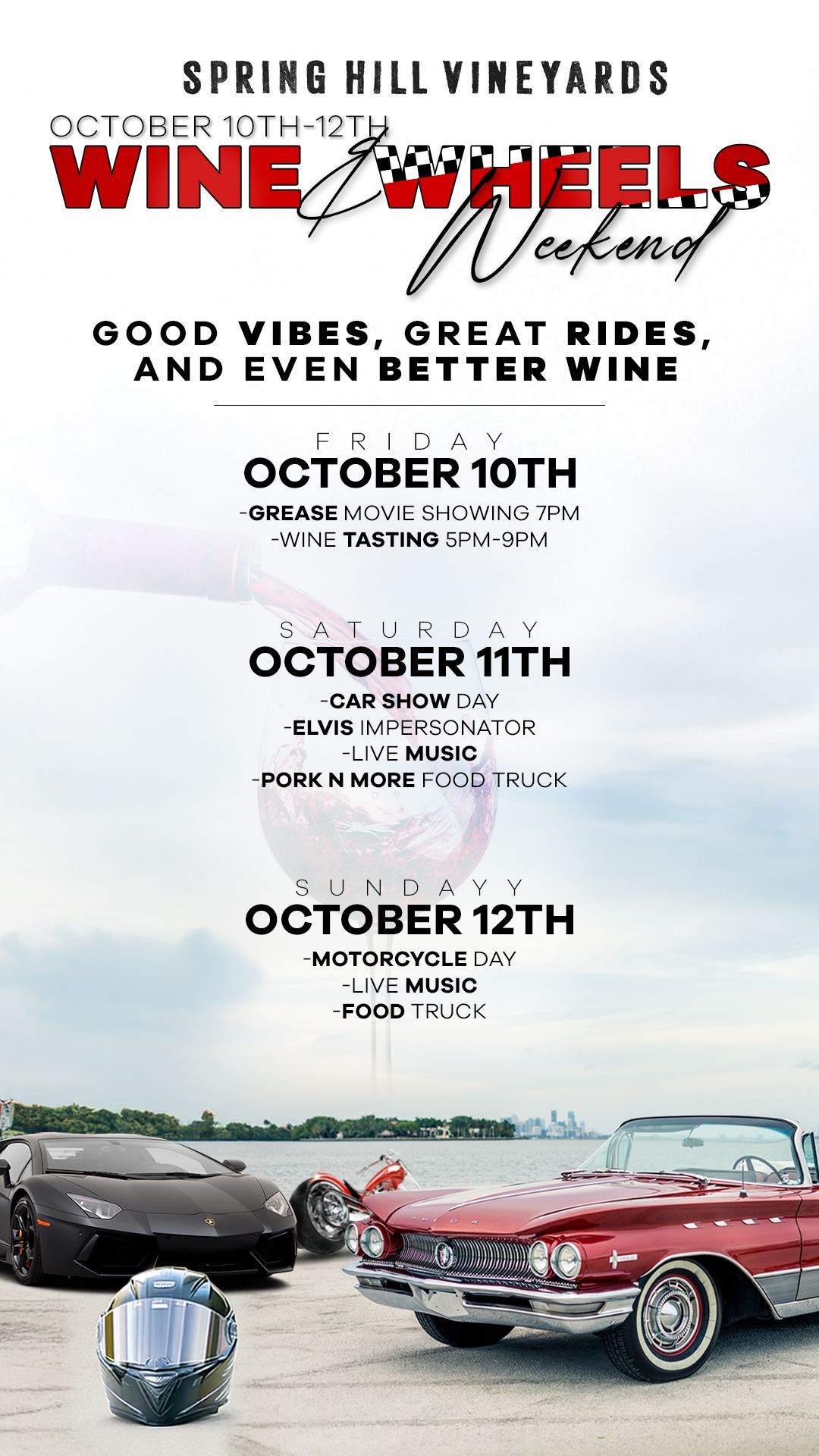 Join us October 10th–12th at Spring Hill Vineyards for a high-energy weekend of classic cars, motorcycles, live music, food trucks, and of course, incredible wine. Whether you're a gearhead, a wine lover, or just looking for a fun fall escape, this is the event to mark on your calendar.